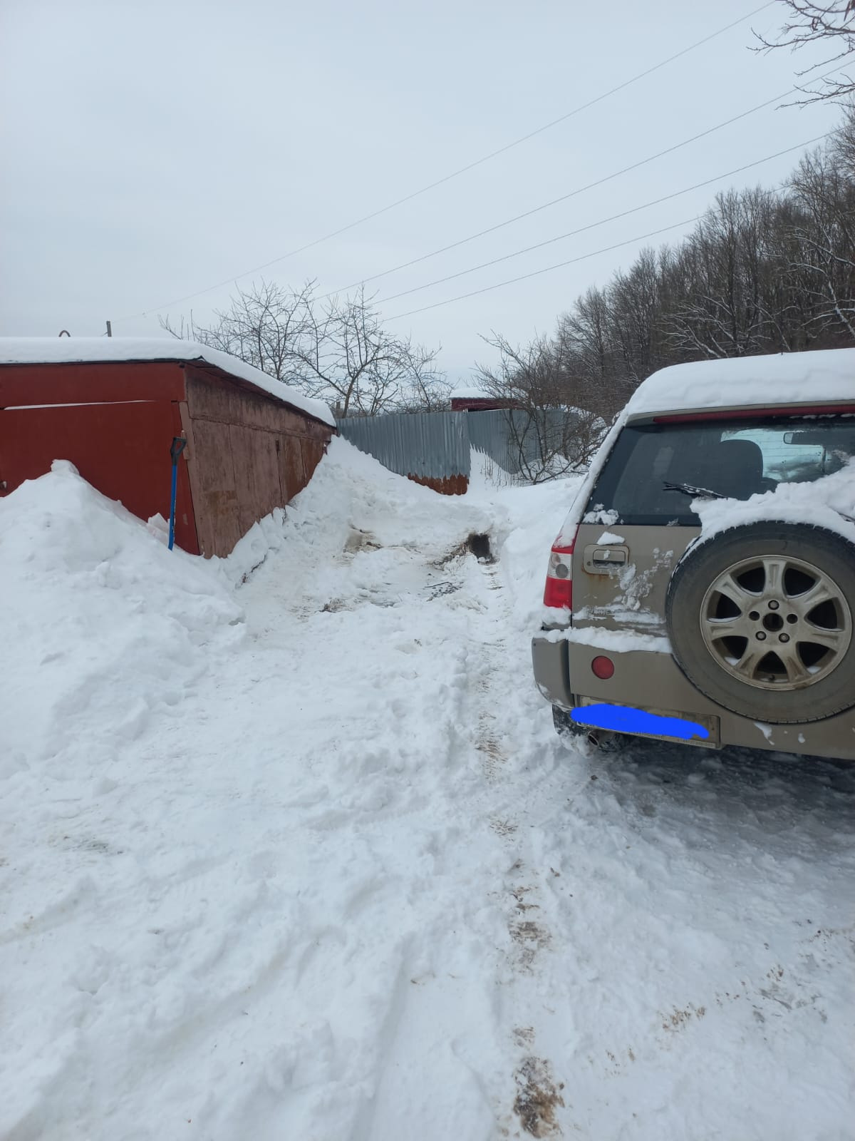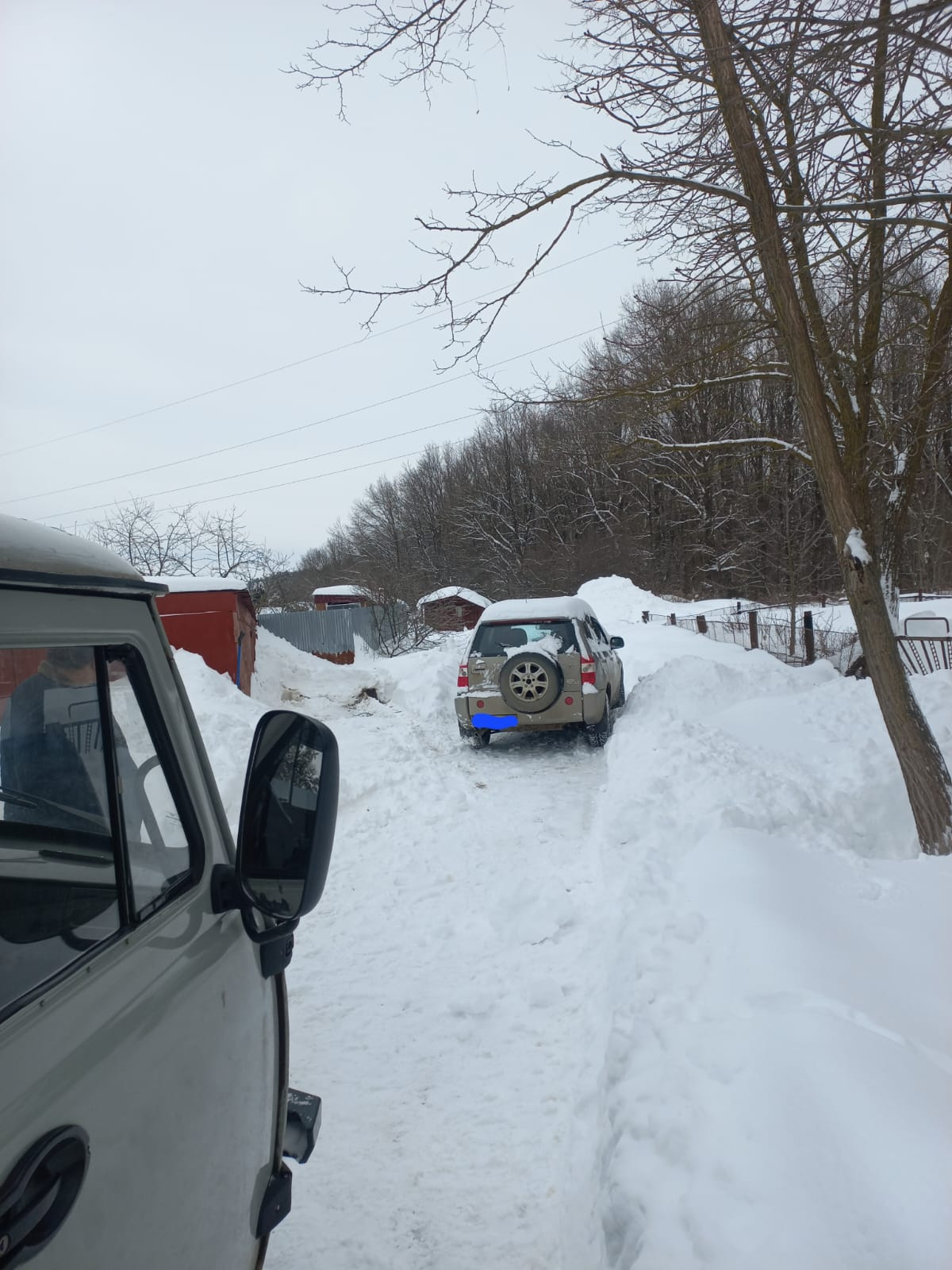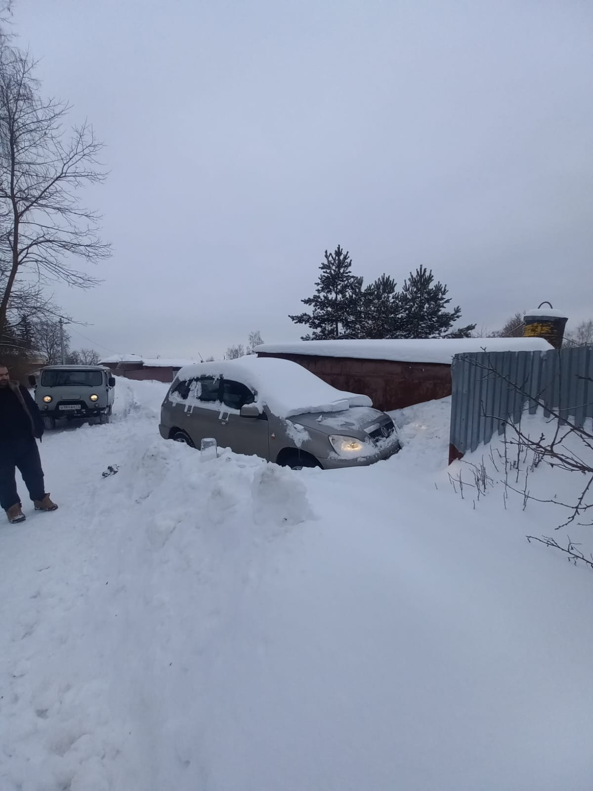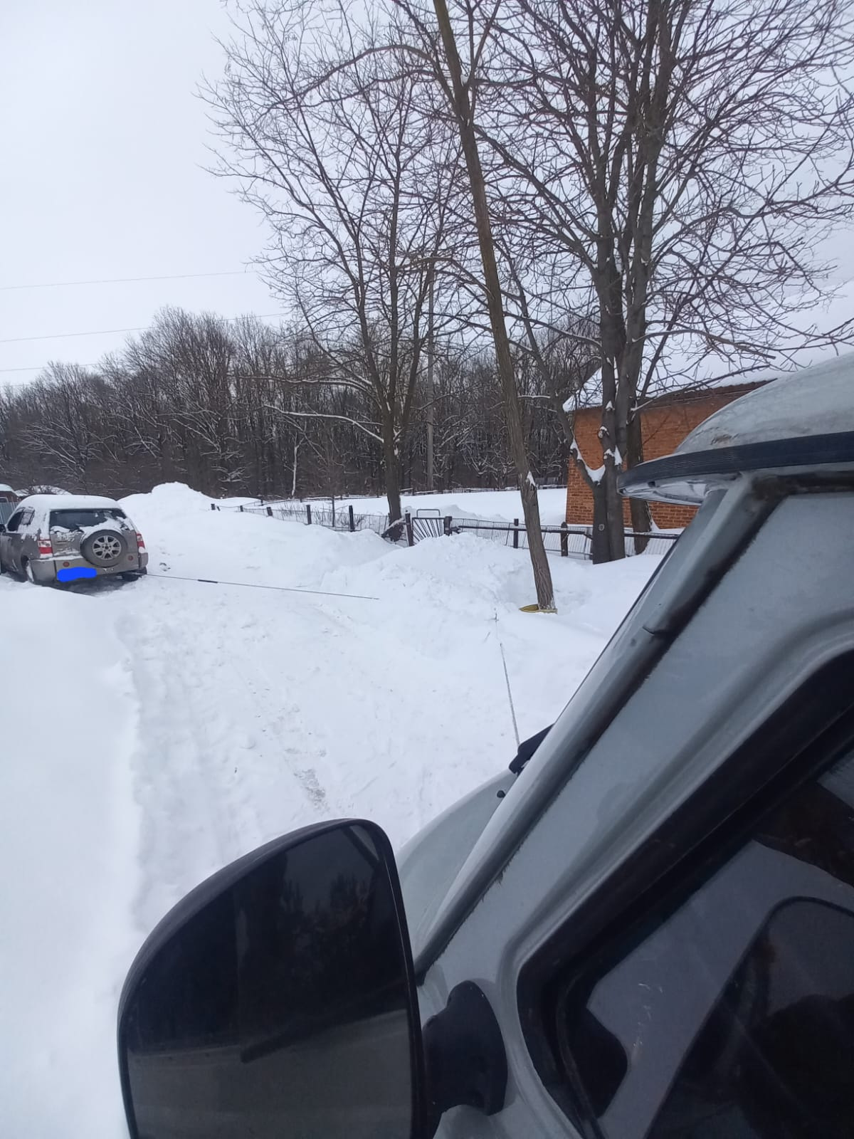 Черри Тигго не смог после снегопада выехать со стоянки. Был аккуратно извлечен из снежного плена при помощи лебедки, через блок.
